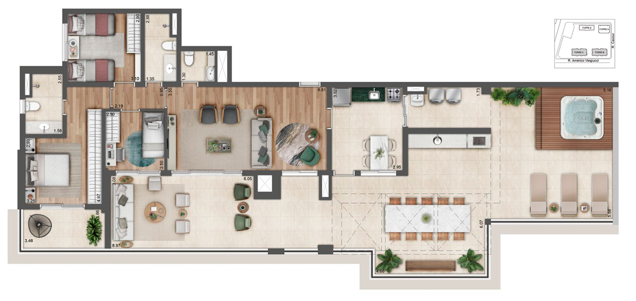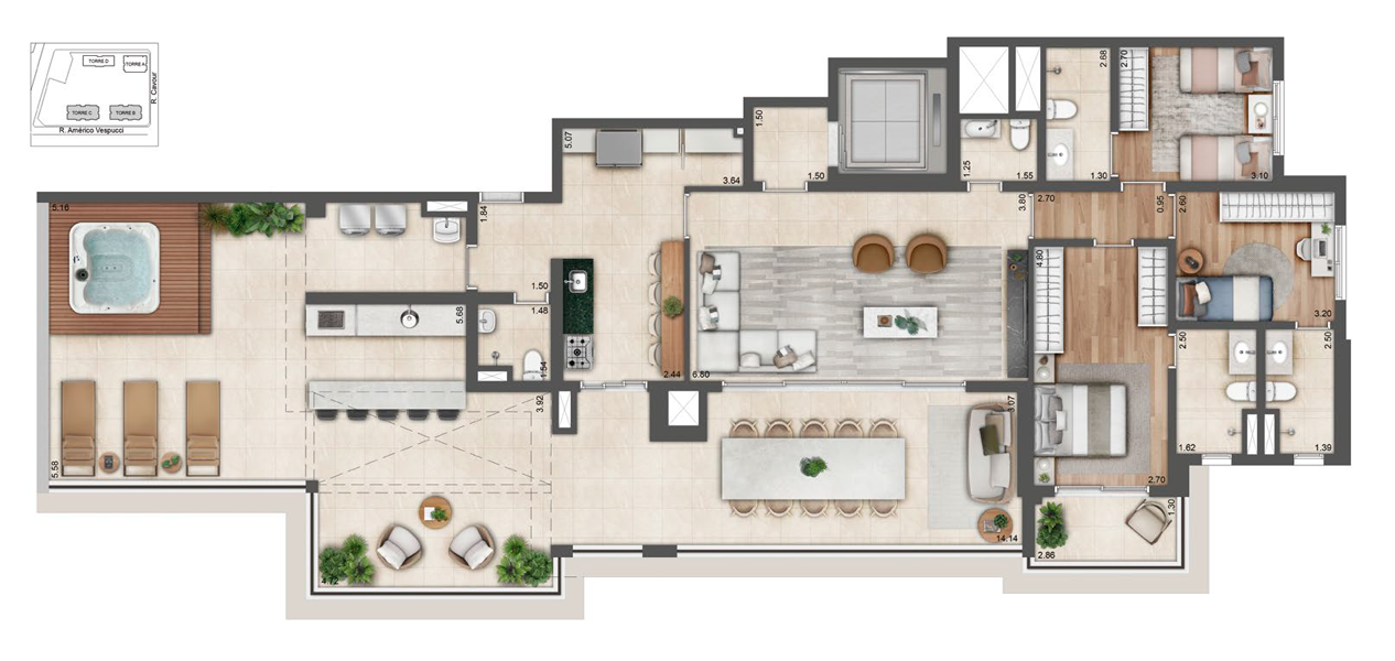 O projeto conta com parque aquático de 1.000 m2 para toda a família e mais de 30 itens de lazer, distribuídos em mais de 18.000 m2, além de serviços exclusivos, oficinas de esportes e conveniências.