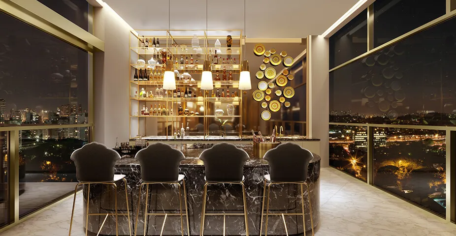 A Lavvi encontra luxo no fatto a mano e se inspira no centro internacional da arte, moda e design: a Itália, berço da Versace Home. Influenciada por essa estética, a empresa brasileira traz a exuberância da marca italiana para o projeto Villa. Os interiores são caracterizados pelo uso sofisticado de branco, preto, azul e dourado, que dão o tom do decor com assinatura Versace. As áreas de estar são enriquecidas com designs da Versace Home, que vão desde os papéis de parede e iluminação a móveis finos – todos feitos na Itália.